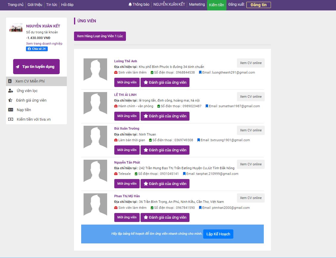- Xem ứng viên miễn phí: